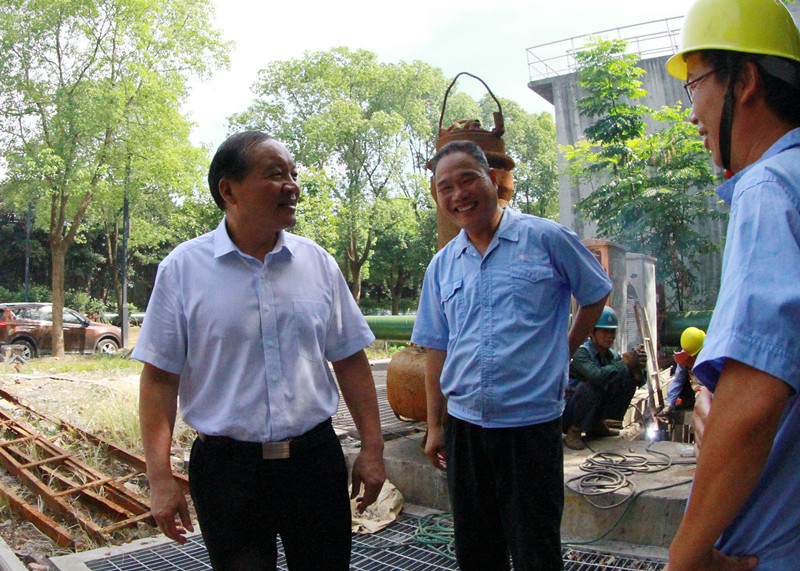 圖為集團(tuán)副總經(jīng)理、紹興水處理公司董事長(zhǎng)胡張堯在紹興水處理公司放空泵房導(dǎo)軌更換現(xiàn)場(chǎng)慰問(wèn)維修人員