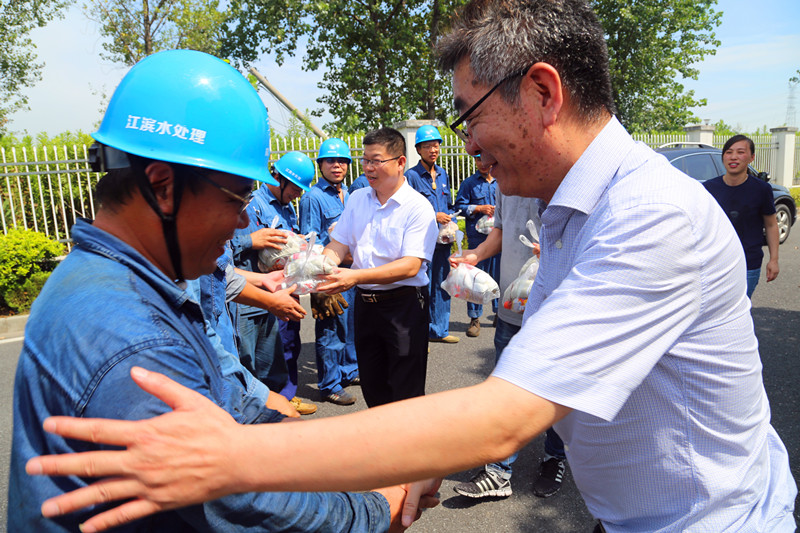 圖為集團(tuán)副總經(jīng)理張則再在江濱水處理公司一體化生化池機(jī)修現(xiàn)場(chǎng)慰問(wèn)運(yùn)行工人