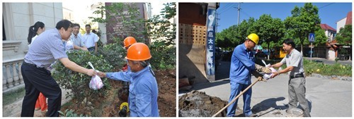 7月17日上午,集團公司黨委副書記、紀委書記高小林、副總經(jīng)理王嘉賢在公司領導的陪同下,到城區(qū)唯美品格紫薇園和紫郡花園工地現(xiàn)場慰問供水一線職工,送上防暑慰問品,并叮囑大家在高溫酷暑下作業(yè)要注意做好防暑措施。