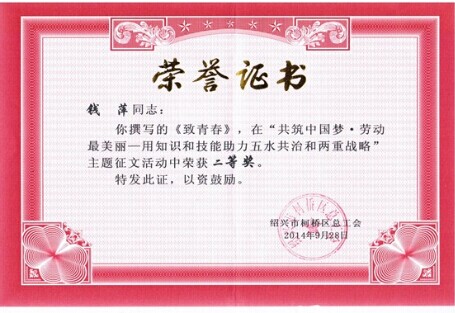 由柯橋區總工會舉辦的“共筑中國夢 ·勞動最美麗----用知識和技能助力五水共治和兩重戰略主題征文比賽中,濱海供水公司錢萍同志的《致青春》榮獲二等獎。